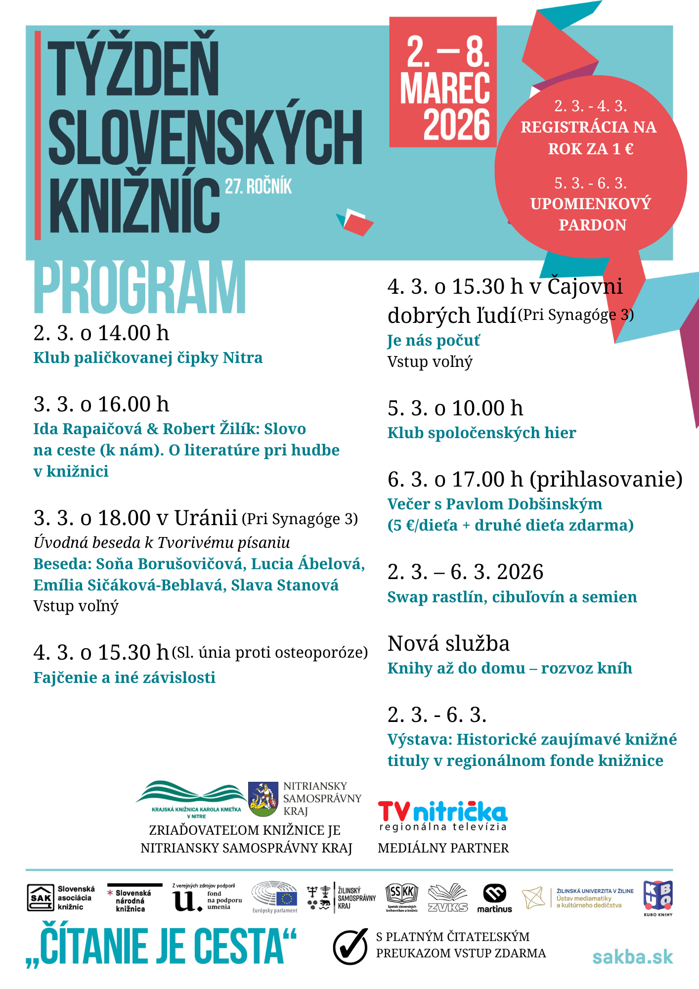 Dámy a páni, predstavujeme vám program Týždňa slovenských knižníc 2026. Krajská knižnica pre vás naplánovala podujatia na každý deň od pondelka do piatku. Pôjde o pravidelné podujatia, ale aj výnimočné a nové aktivity.